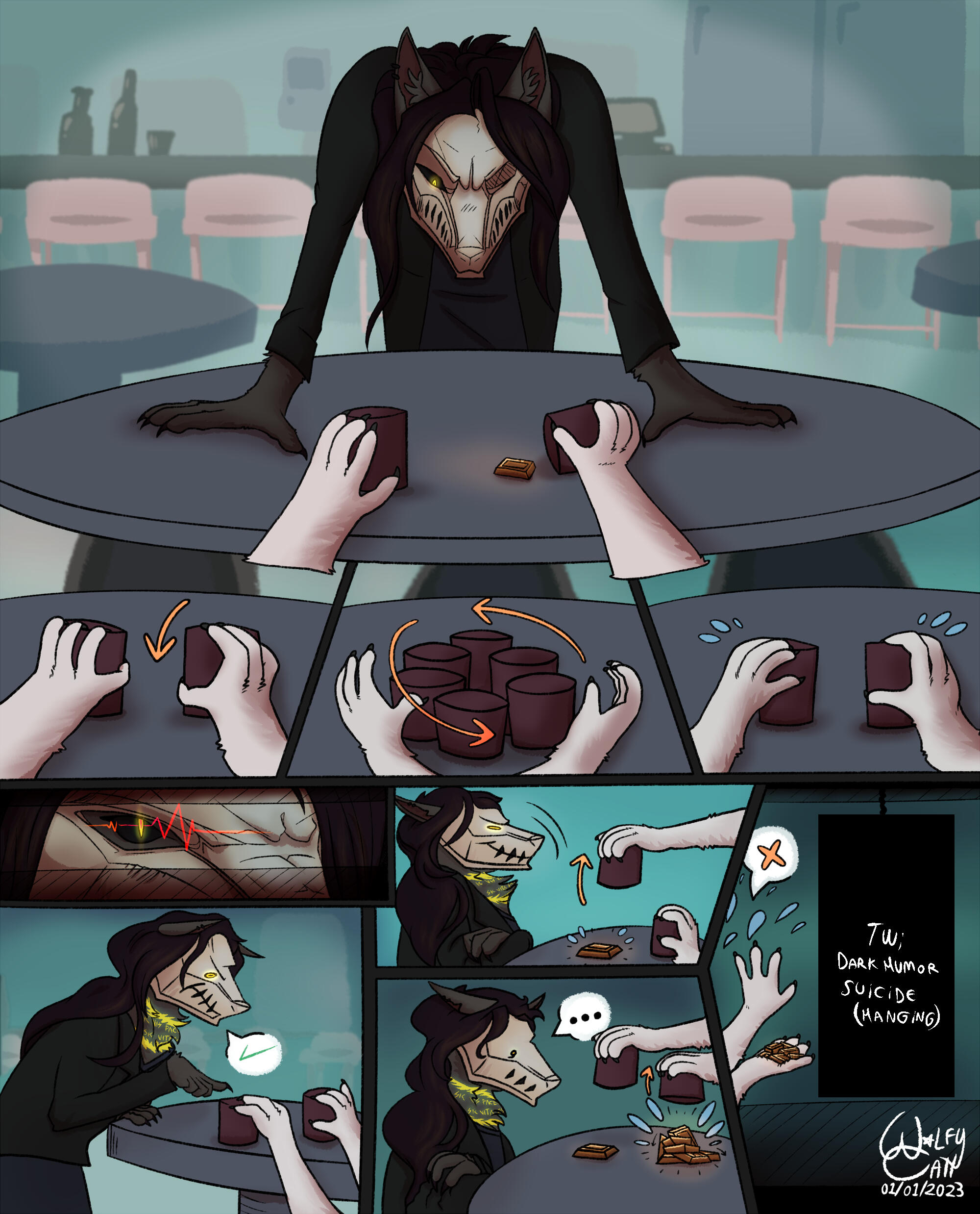 ^A custom comic of any subject you would like, be a character's backstory, a small interaction between characters or a humorous meme. Prices will depend on how many panels there are on the comic and the type of drawings on them.Price for a single page comic with 9 panels (shown above) is 90-150$.Subject matter of the comic has to comply to my ToS rules aswell; Whoever if you are unsure, you may contact me and ask, I do not mind discussing about what I might be unconfortable drawing.^Rendering of the comic - black and white, lineart, cell shaded, etc - will affect the pricing of the comic and will be done either by client's demand or storytelling necessity (suggested by me).